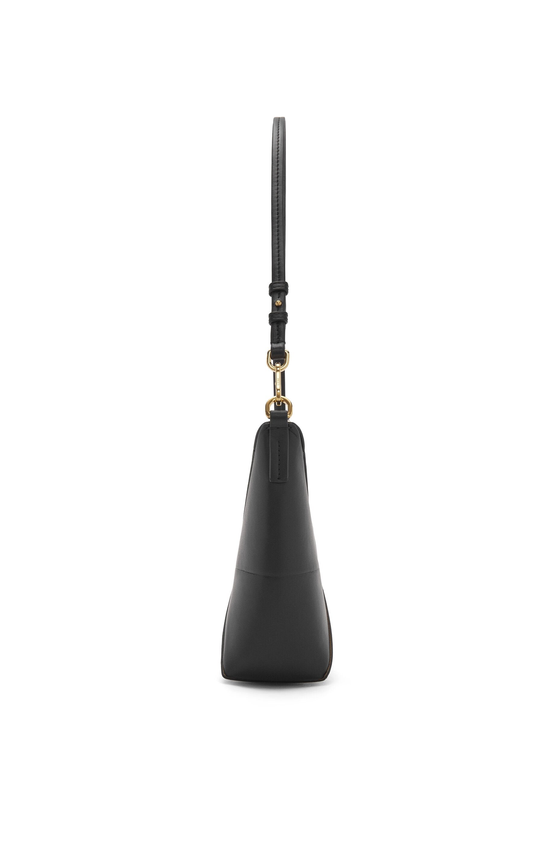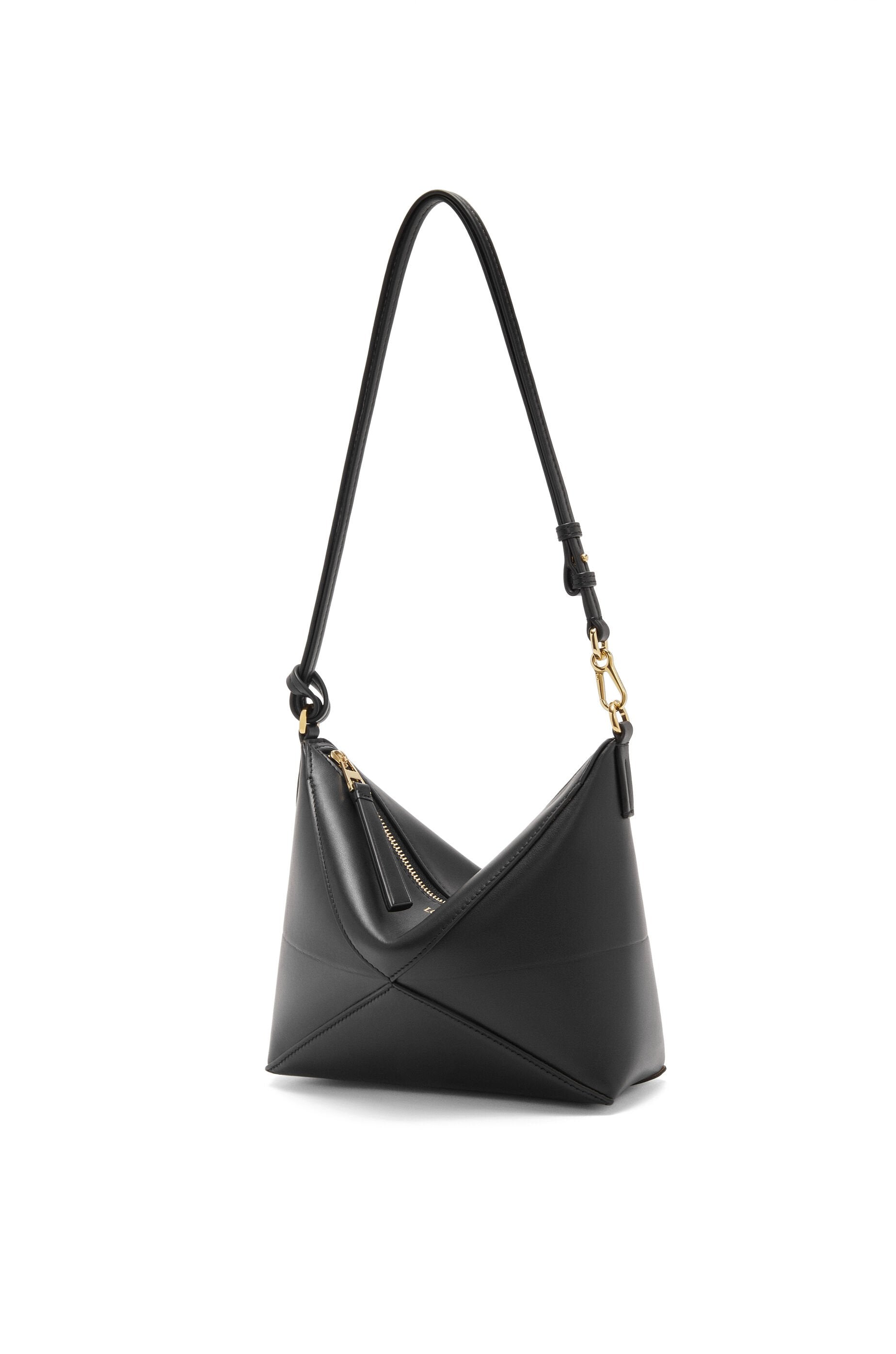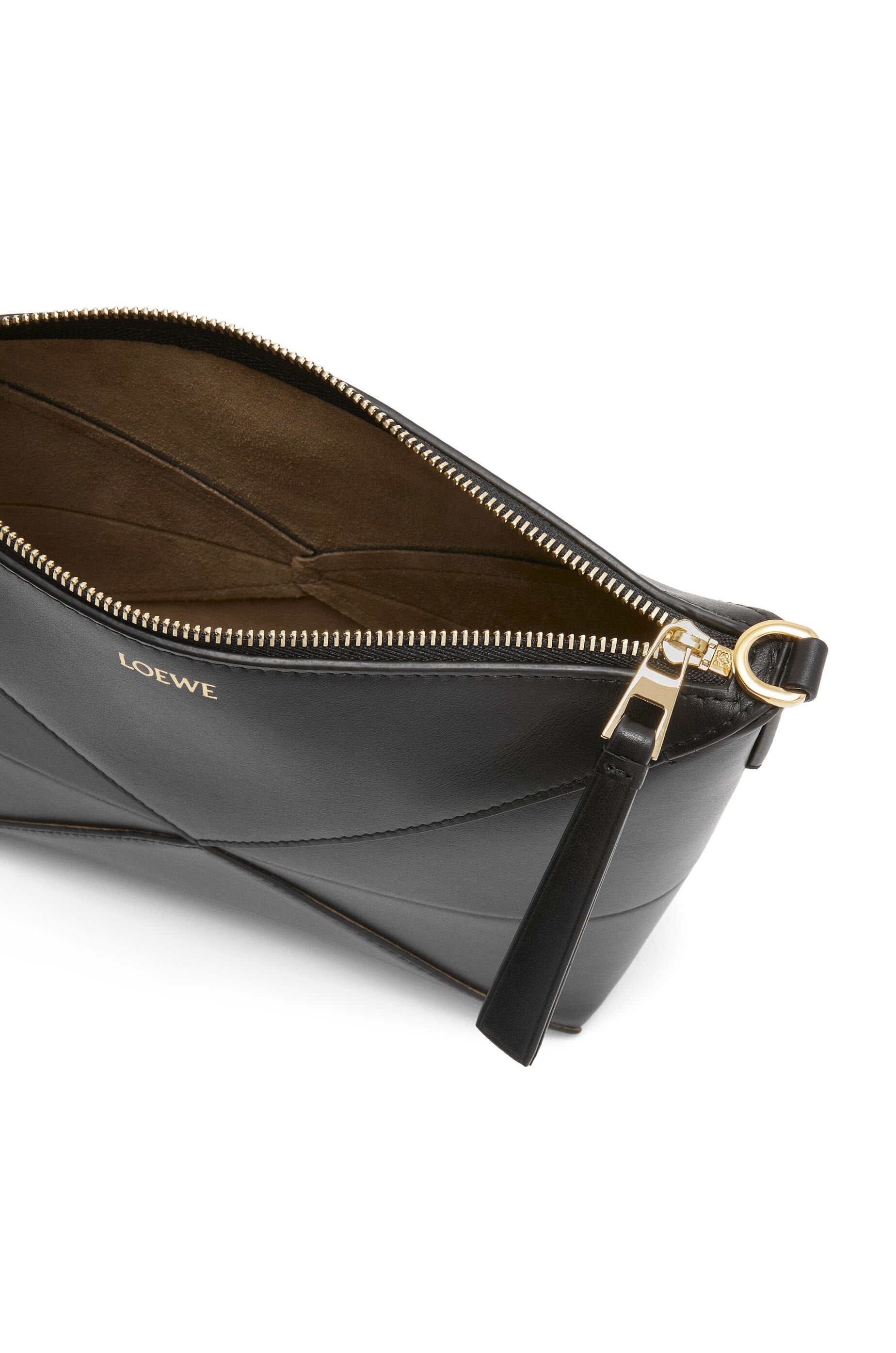 Puzzle Fold pouch in black shiny nappa calfskin with embossed Loewe logo. It features adjustable and detachable shoulder strap, zip closure and one main interior compartment. Suede lining.
